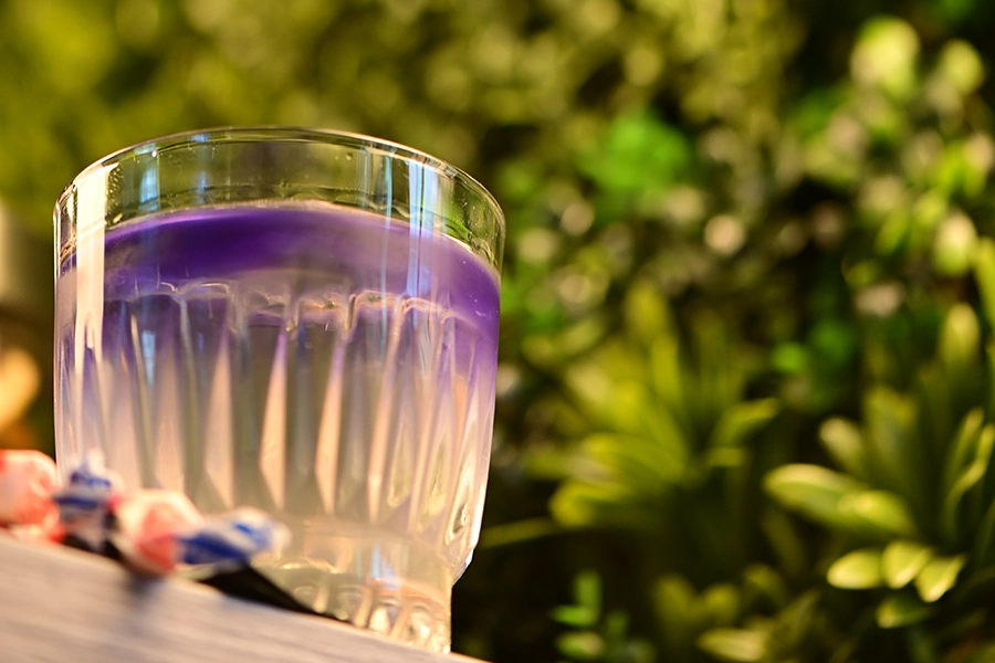 Dealcoholized juniper gin, bergamot cream tea, hibiscus and smoked pandan syrup, coconut milk, with coffee bitters.