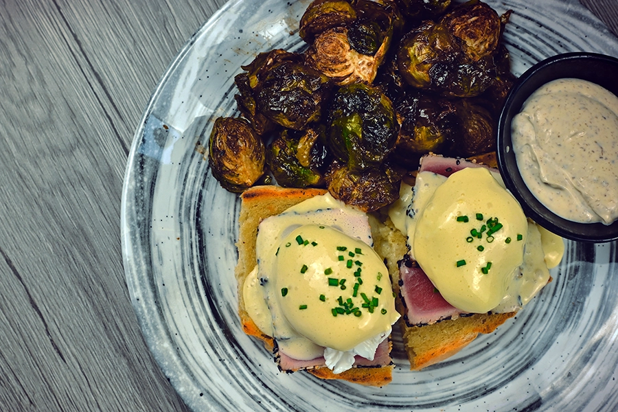 Eggs, seared gravlax, cream cheese, pickled onions, house hollandaise. Served on our in-house bread.